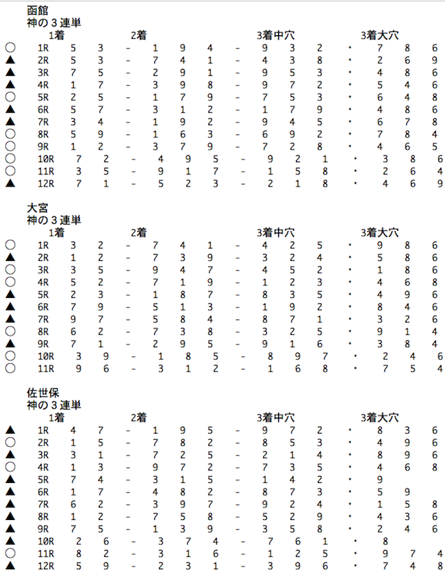 カミケイはフォーメーションでの購入方法となっていて、全レースの予想を配信しています。6月1日の予想メールを見てみましょう。